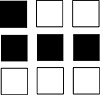 If we omit part of the pattern in Figure 1.7, leaving only the top corners black, as in Figure 1.8, we get the bipolar vector D = (1, -1, 1, -1, -1, -1, -1, -1, -1). You can consider this also as an incomplete or corrupted version of the pattern in Figure 1.7. The network activations turn out to be (4, -2, 4, -4, -4, -4, 8, -2, 8) and give the output (1, -1, 1, -1, -1, -1, 1, -1, 1), which is B.
